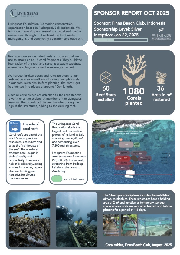 The initiative is led by the Livingseas Foundation, a Bali-based marine conservation organization that focuses on preserving and rebuilding coral reefs through hands-on restoration and community education. FINNS Beach Club joined forces with Livingseas in January 2025 as a Silver Sponsor, committing to support both coral planting and public awareness about ocean health.